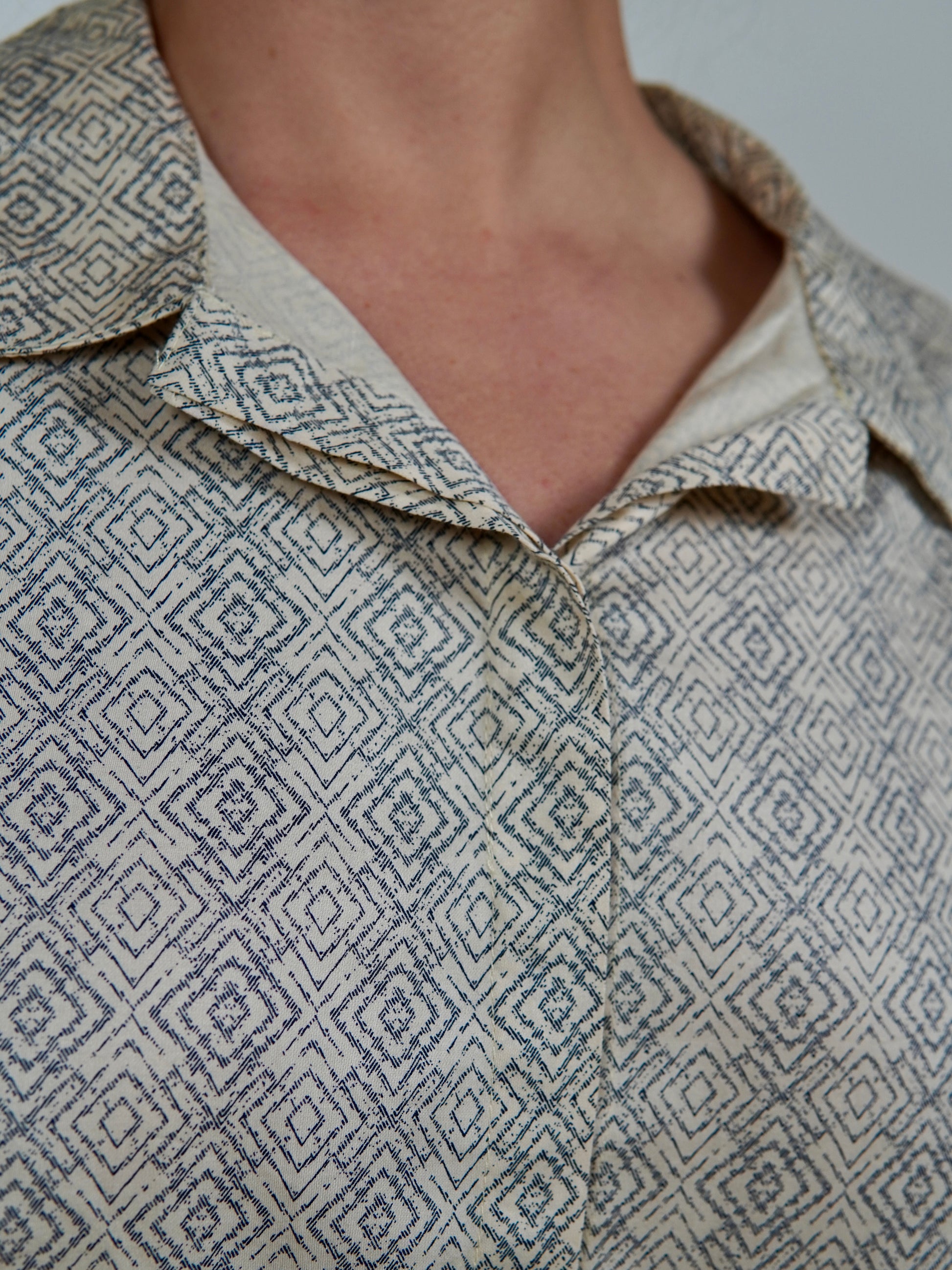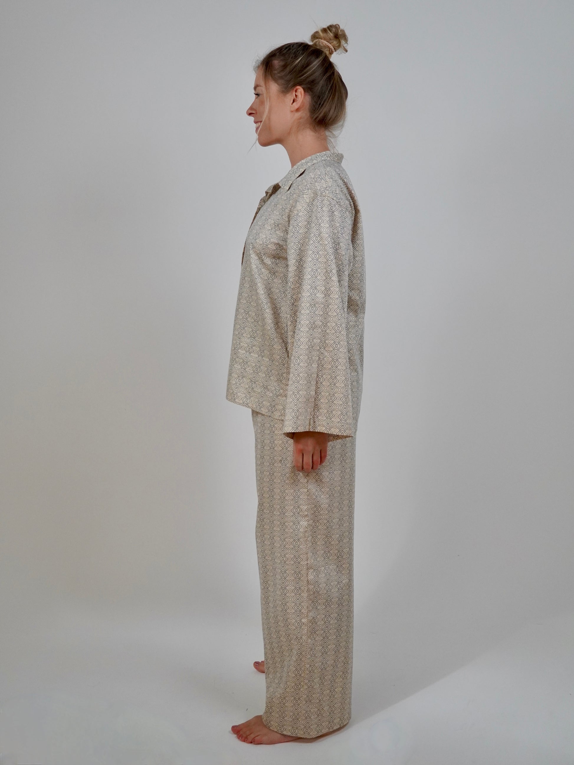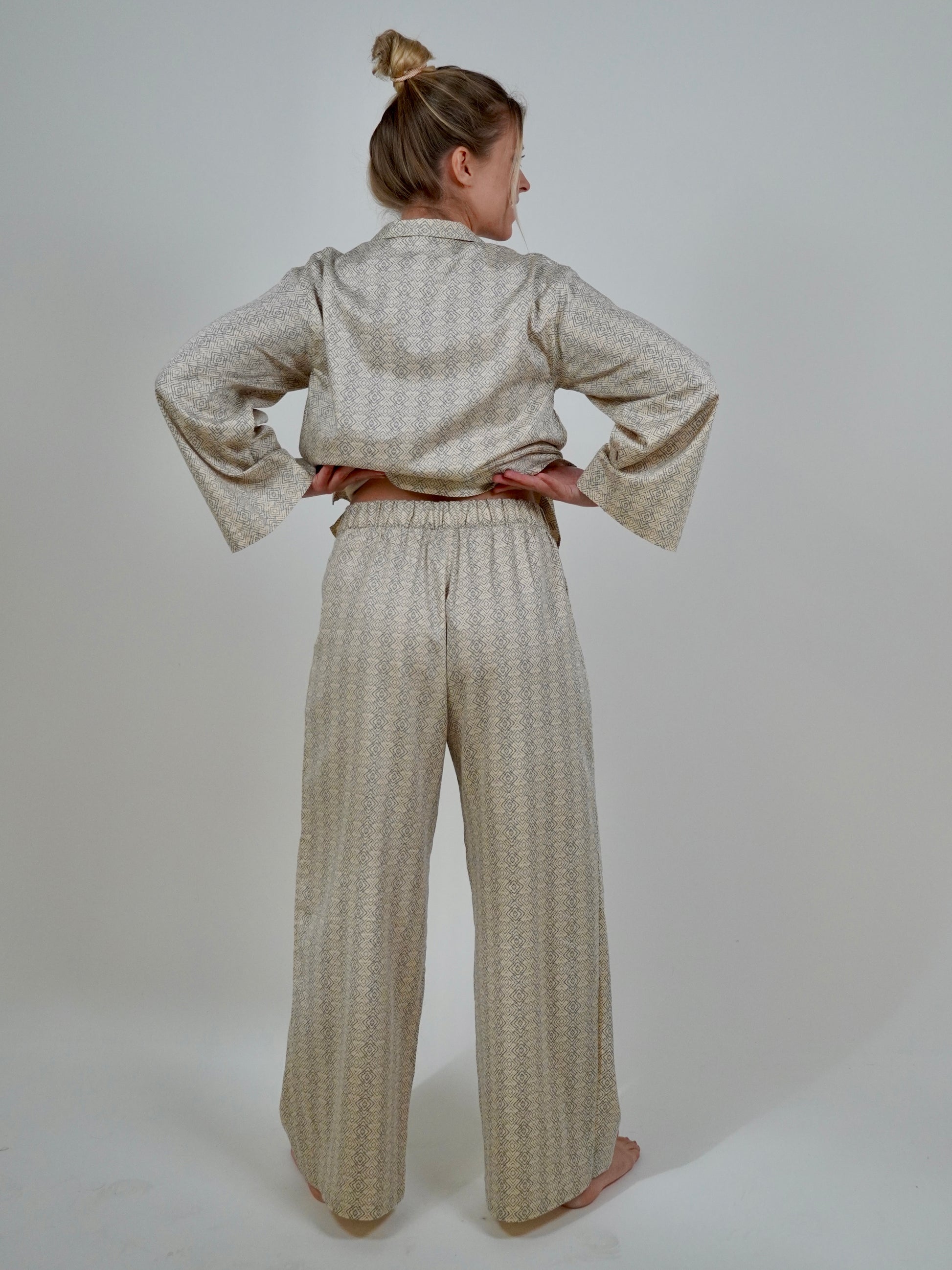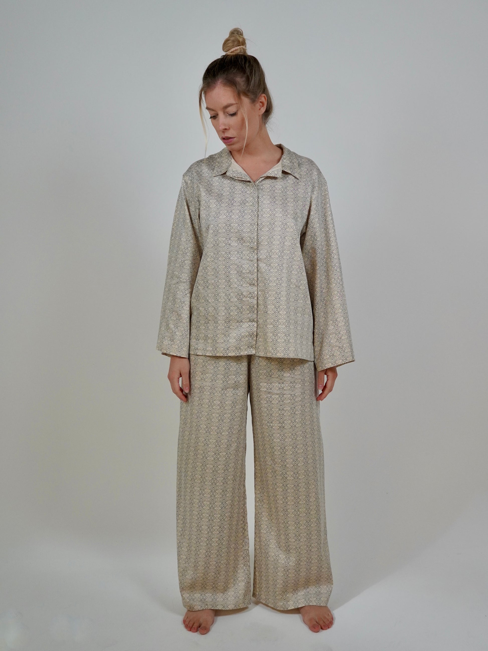 Featuring a geometric print on a satin cotton fabric, this set is fashionable enough to wear to a 9am meeting. The hidden drawstring waistband guarantees fit for style, while the oversized shirt with wide sleeves ensure comfort from day to night.