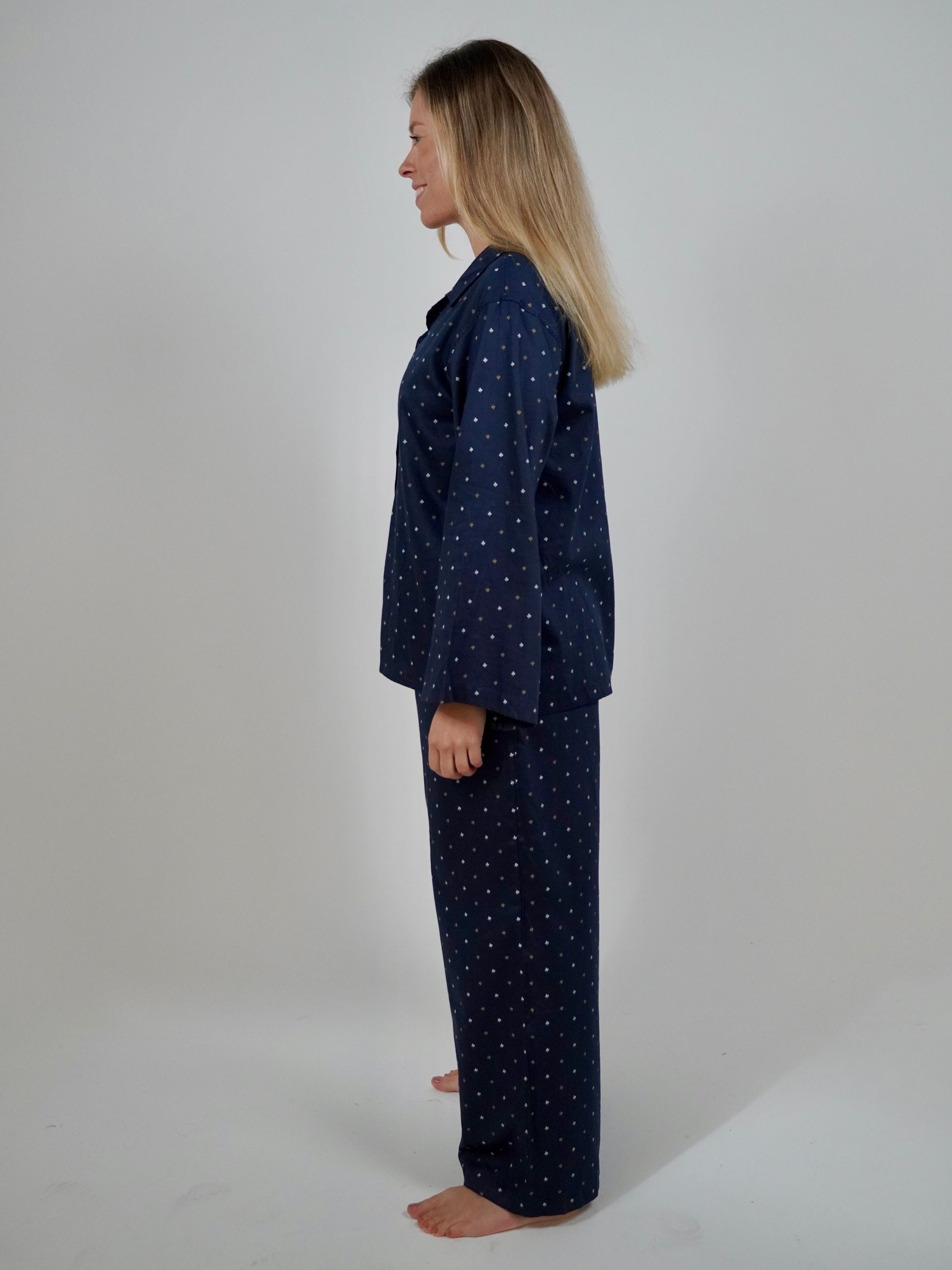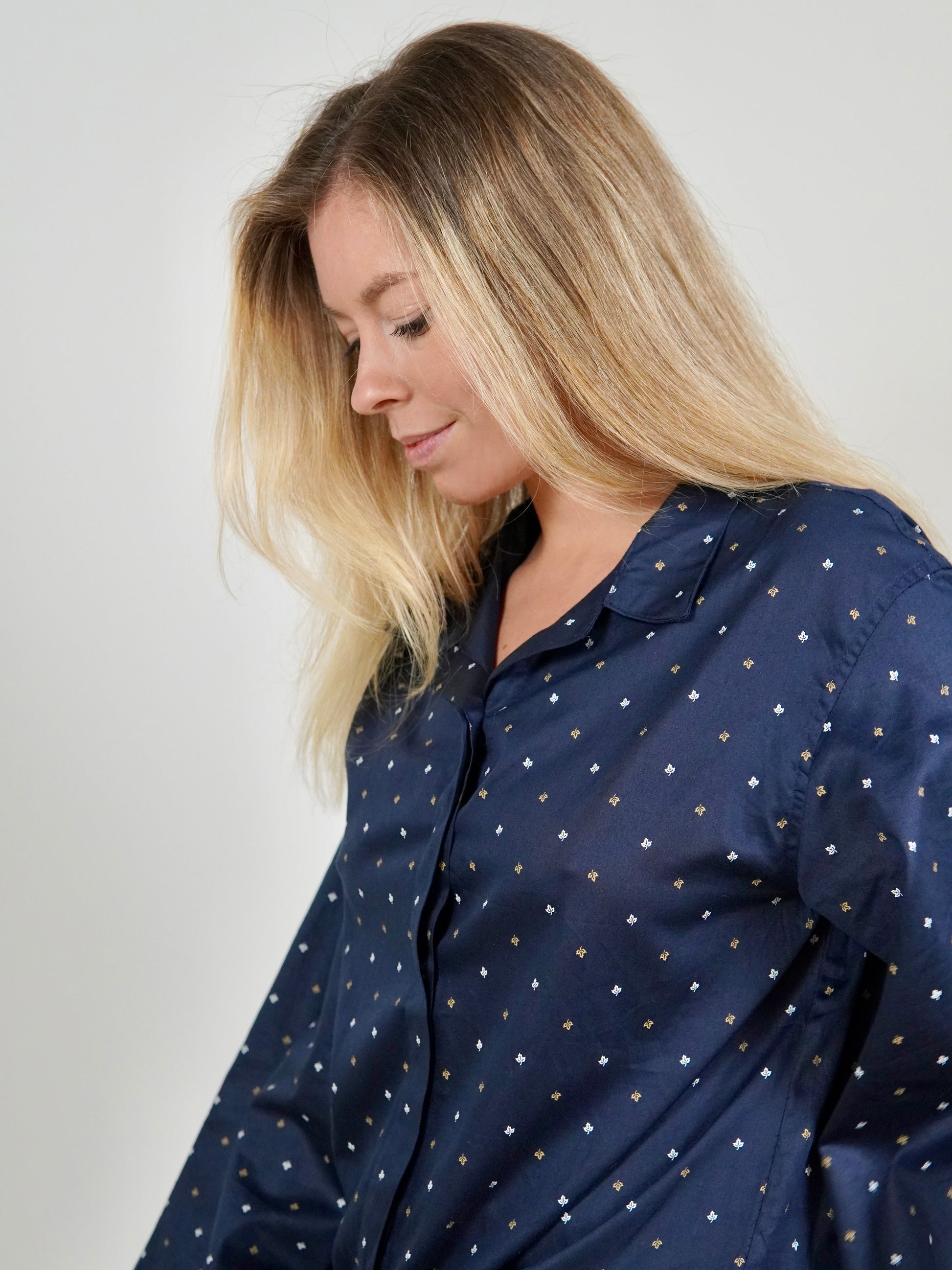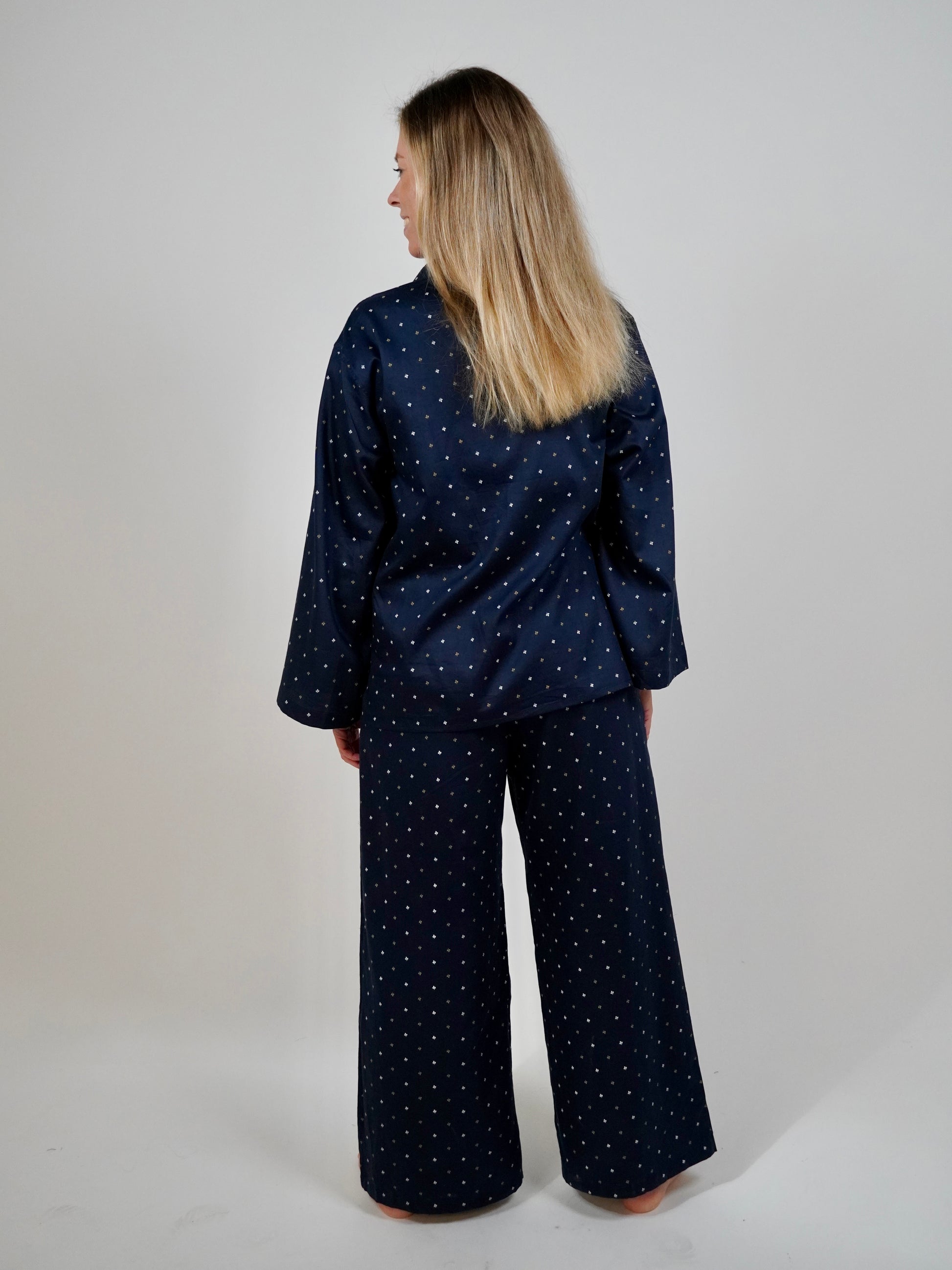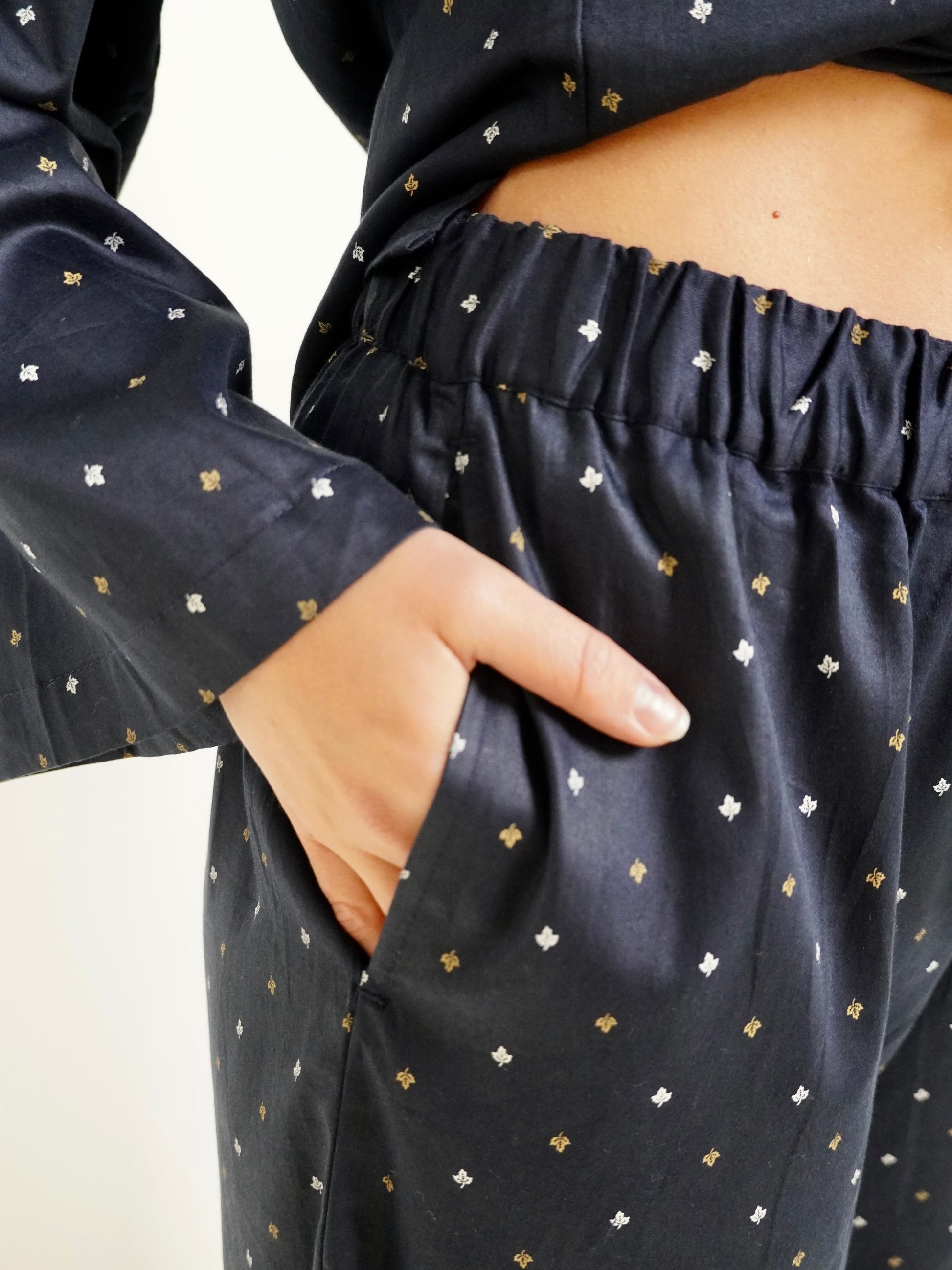 Featuring an elegant navy blue satin cotton fabric, this set is fashionable enough to wear to a 9am meeting. The hidden drawstring waistband guarantees fit for style, while the oversized shirt with wide sleeves ensure comfort from day to night.